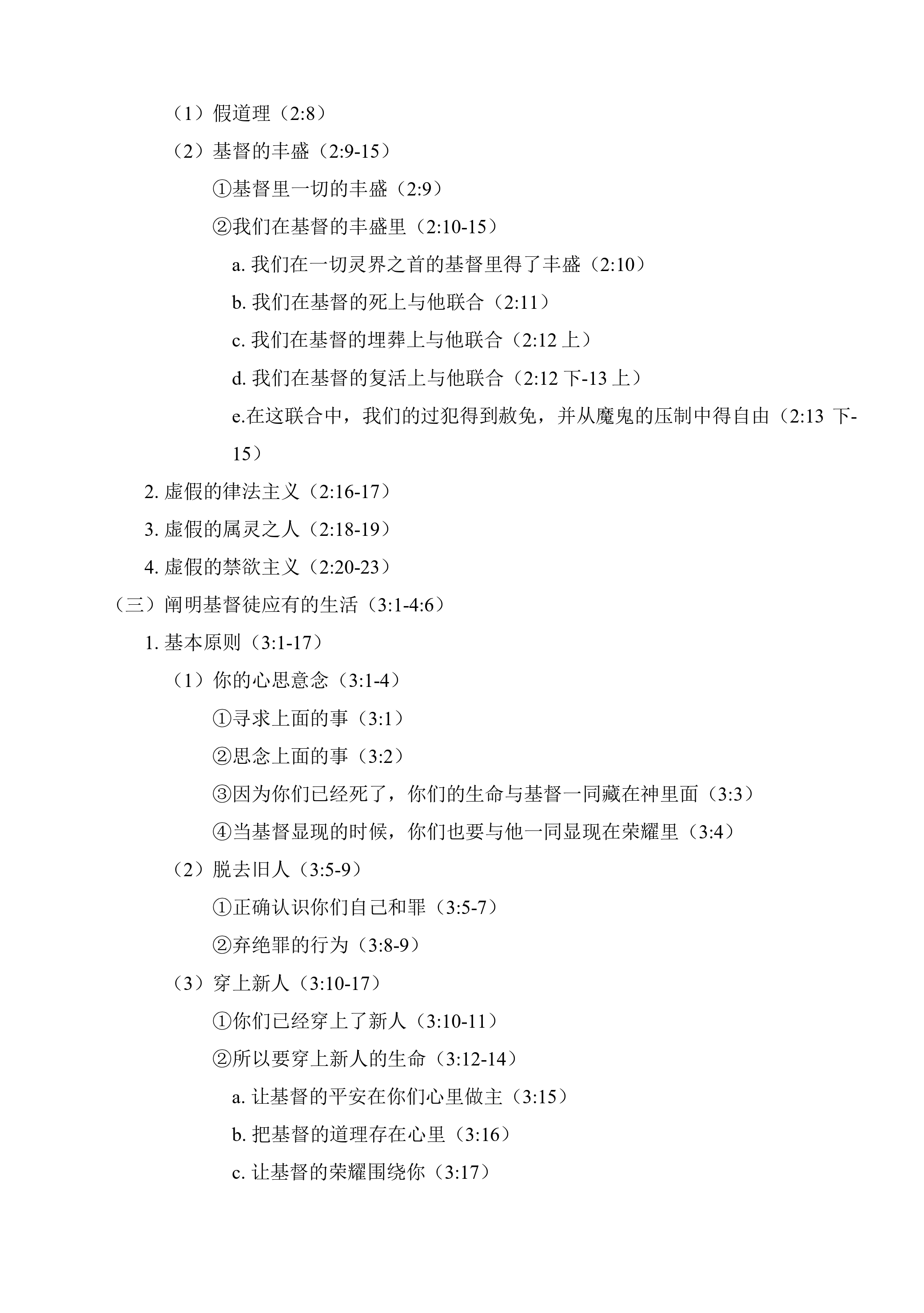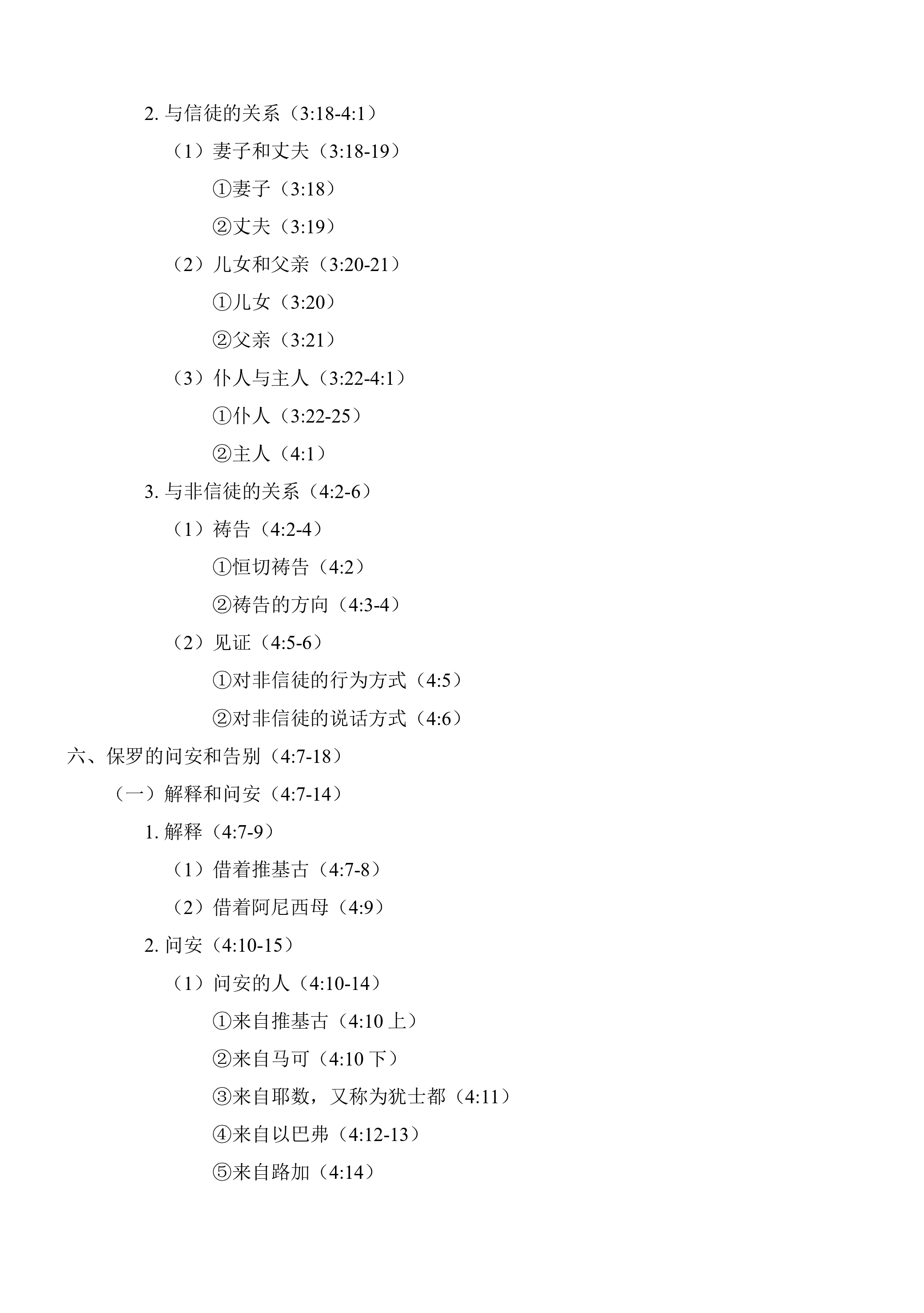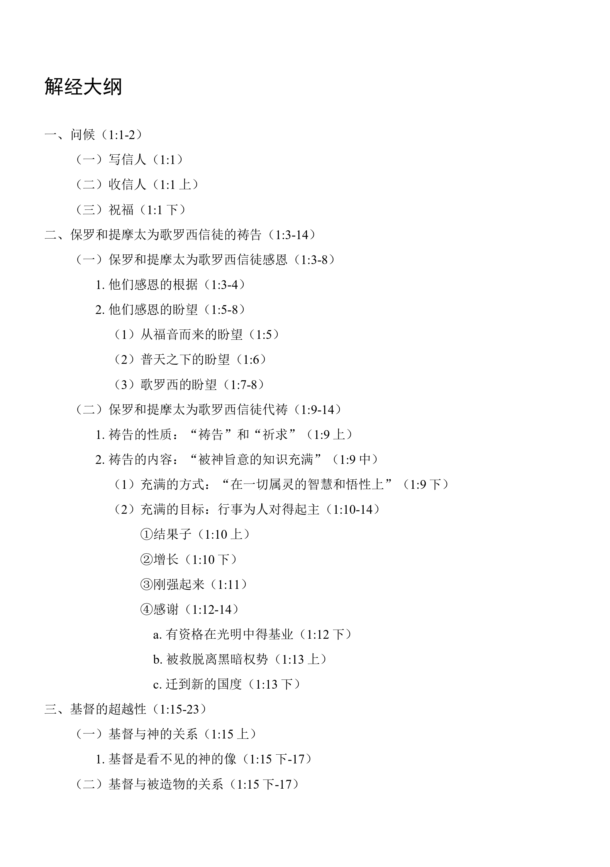 接下来是针对系列讲道和独立主题讲道的一些建议。首先,我给出歌罗西书的解经大纲,接下给出讲解歌罗西书的三种可能的方式:(1)一篇覆盖整卷书的独立讲道;(2)一个较短的系列信息;(3)一个较长的系列信息。当然,这些还可以进一步扩充。在有些情况下,你划分书信的方式可能与我在这里提供的有所不同。希望我的建议能为你讲解这些神圣话语提供一些素材。作为神的仆人,你的责任就是反复咀嚼这些经文,直到神从他的话语中把所要给他子民的信息显明给你。