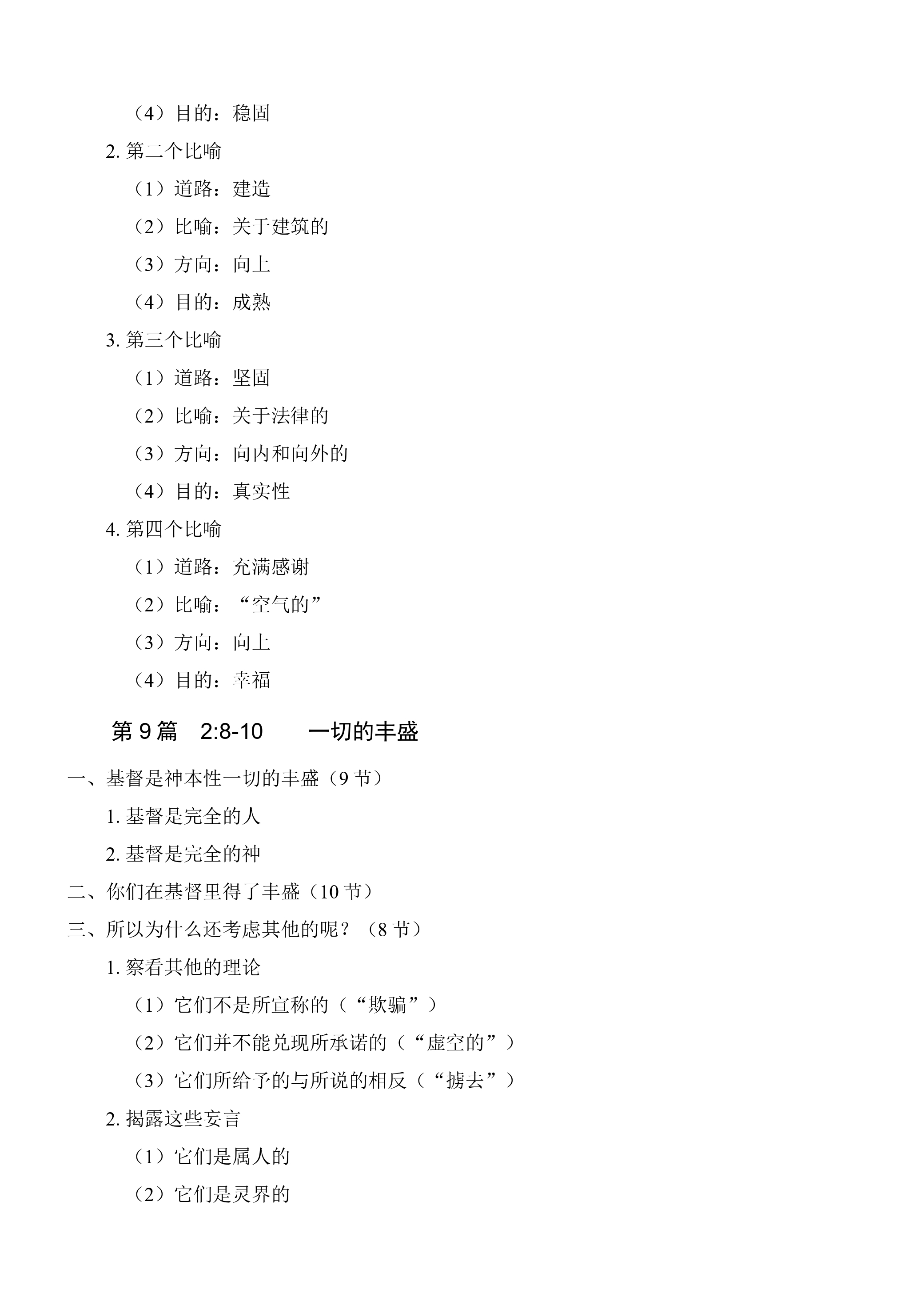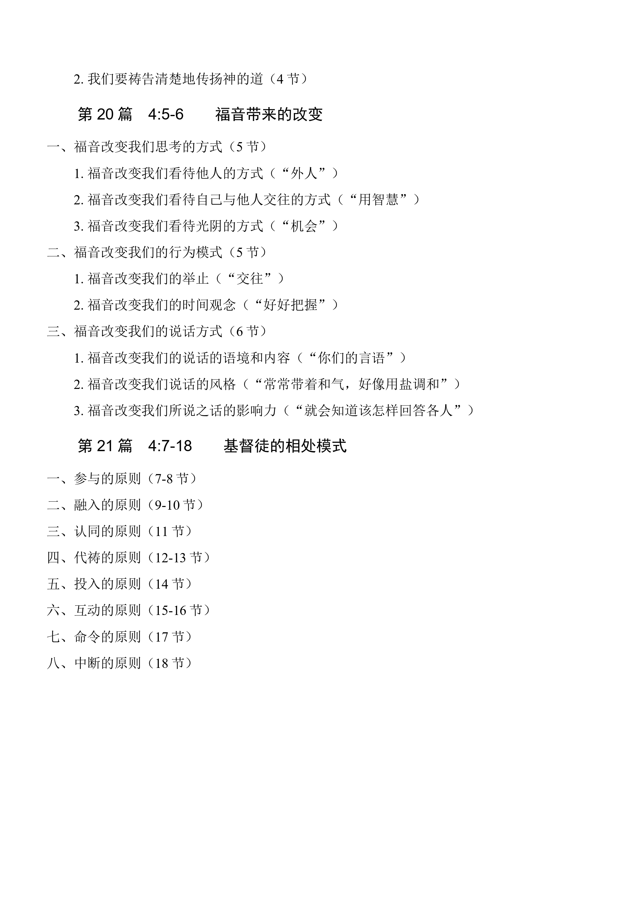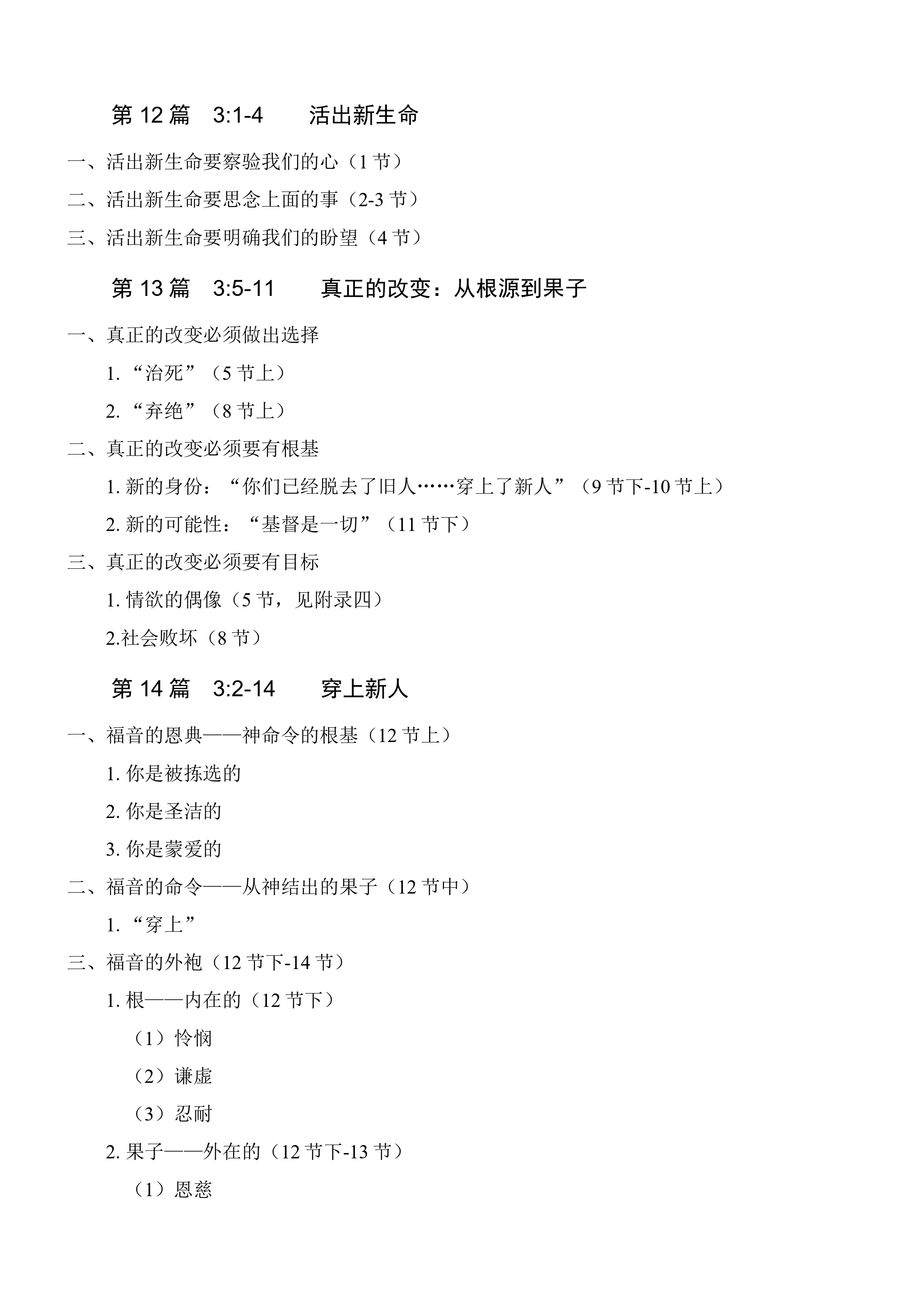 接下来是针对系列讲道和独立主题讲道的一些建议。首先,我给出歌罗西书的解经大纲,接下给出讲解歌罗西书的三种可能的方式:(1)一篇覆盖整卷书的独立讲道;(2)一个较短的系列信息;(3)一个较长的系列信息。当然,这些还可以进一步扩充。在有些情况下,你划分书信的方式可能与我在这里提供的有所不同。希望我的建议能为你讲解这些神圣话语提供一些素材。作为神的仆人,你的责任就是反复咀嚼这些经文,直到神从他的话语中把所要给他子民的信息显明给你。