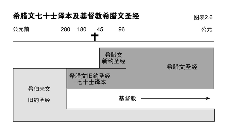 亚历山大的学者于公元前280年把五卷律法书(摩西五经)译成希腊文;到了公元前180年,整部旧约圣经的翻译工作便完成了。这旧约圣经的“现代译本”(后来称为“七十士译本”)在以后两个世纪的希腊帝国里通行,所以在耶稣和使徒时代,旧约希腊文译本已普遍通用。[16]当然,犹太人仍视希伯来文旧约圣经为神的圣经。请细读图表2.6,并思想以下资料。