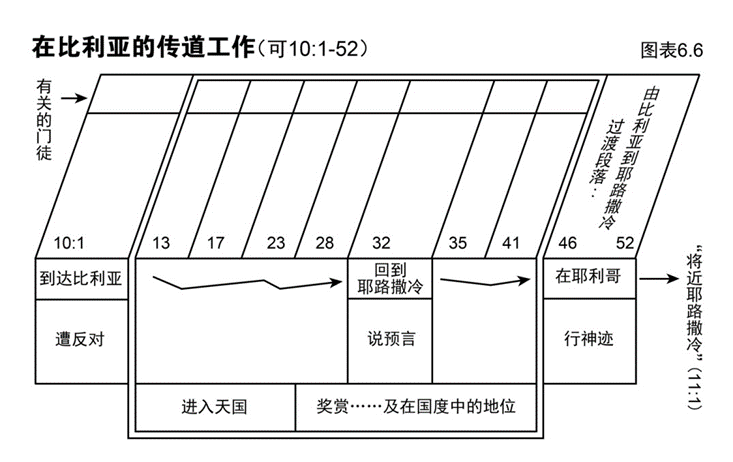 参阅图表6.2,并留意马可省略了耶稣在犹太后期的传道工作,以及在比利亚的部分事工。马可福音第10章全章记载了耶稣在比利亚后期的工作。图表6.6显示这一章的内容编排,读时请参阅它。