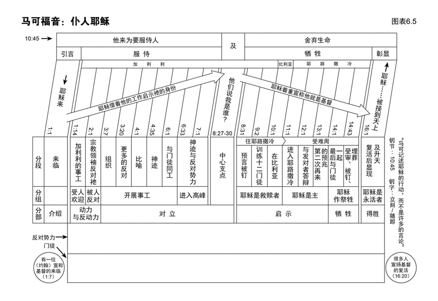 图表6.5是马可福音的综览图表,请留意我们刚提过的重点。