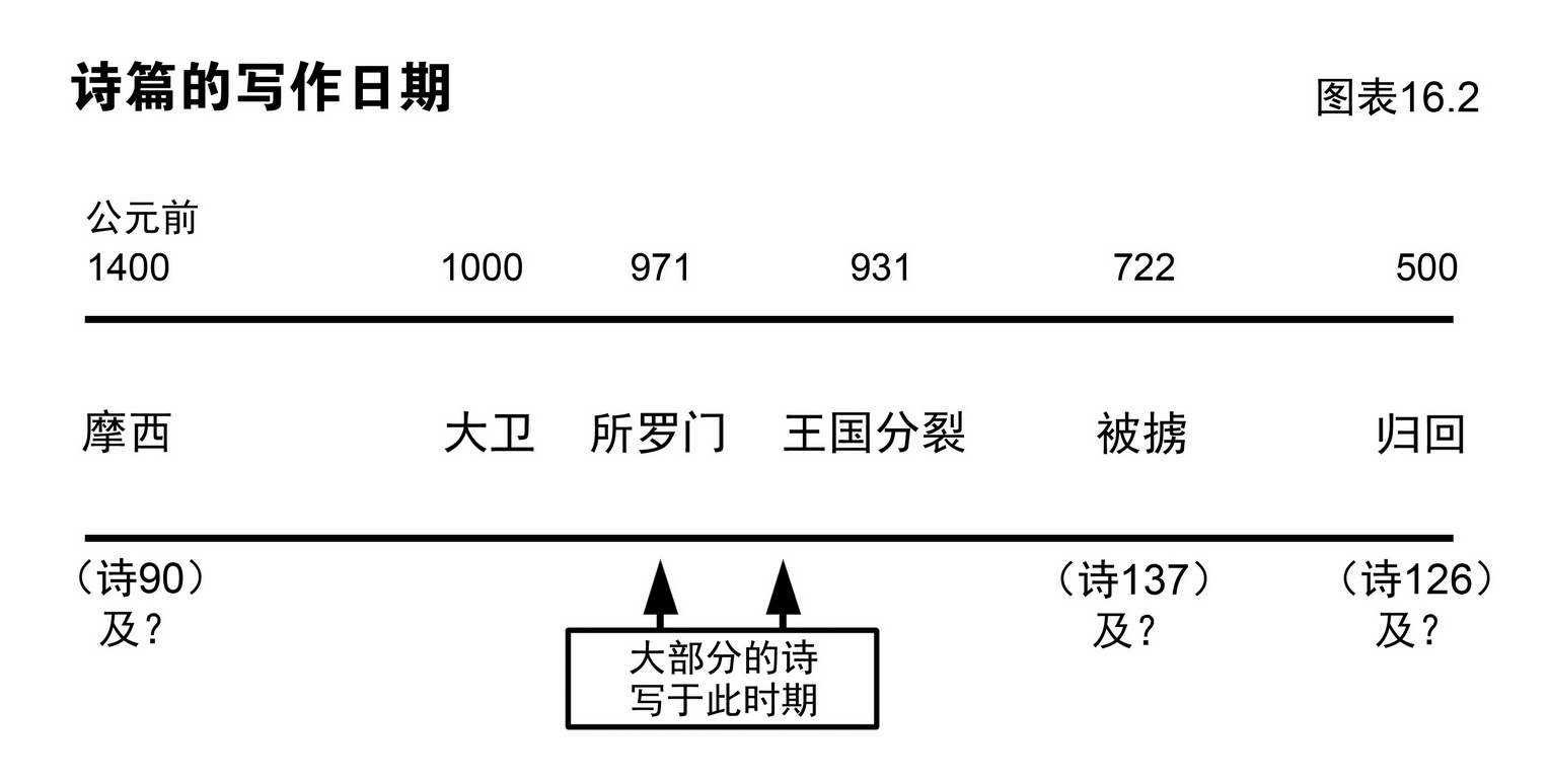 从诗篇的作者和文中的历史资料推测,本书的写作历时约共五百年,即公元前1000至公元前500年之间,请参图表16.2