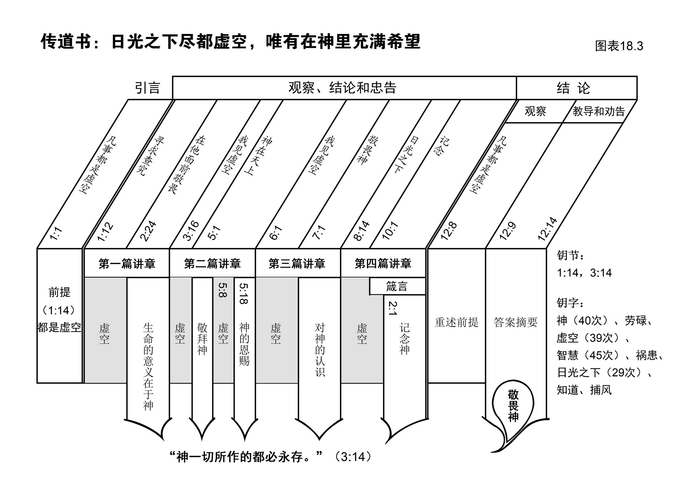 观察图表18.3斜行内的内容,那是传道者在各讲章的第一部分中,以常人的眼光观察得来的见闻,因此“我见”一词不断出现(例如4:7)。每一篇讲章的第二部分也有作者的观察,但它们的主要内容则是神的教导和劝诫。