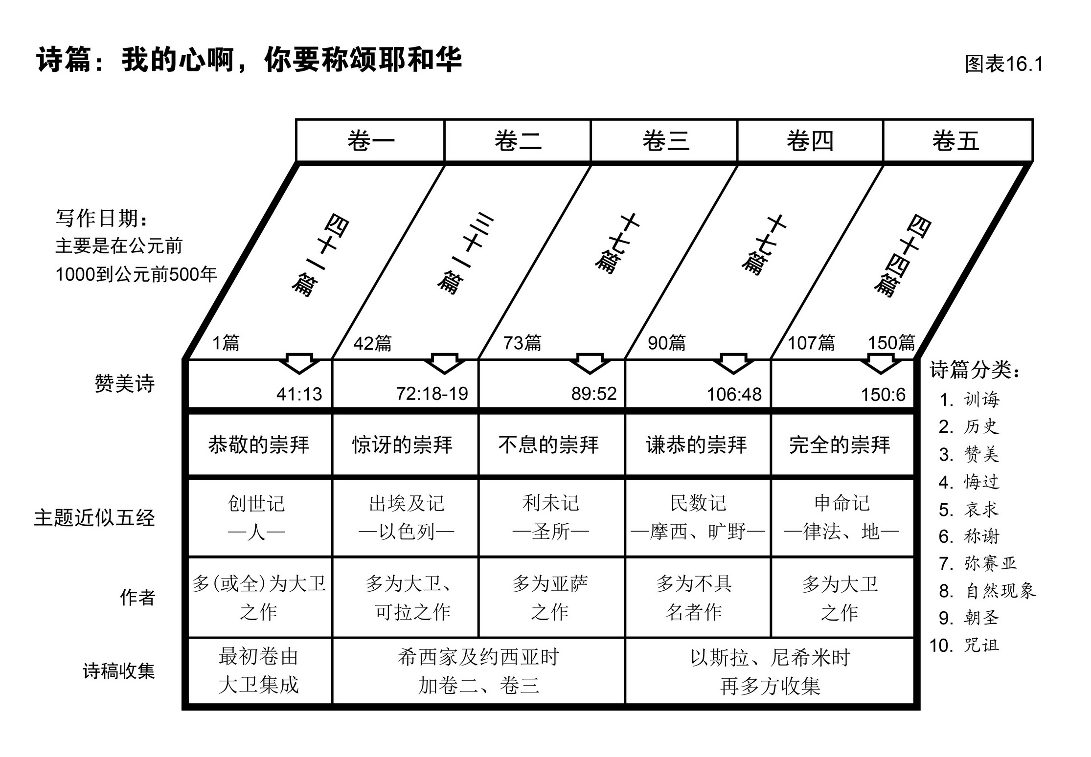 卷三 王国时代的 默想与敬拜 以色列王国初期,神默示一些作者,以诗、歌和对话等形式表达他们心里的思想与疑问。他们所写的书合共五卷,称“诗歌书”,是旧约圣经中的第三组。这五卷书是约伯记、诗篇、箴言、传道