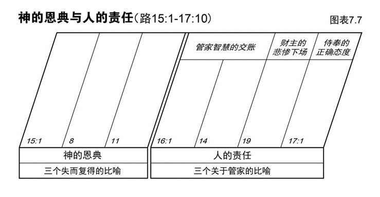 我们已知道路加福音第三个主要部分(9:51-19:27)记满了比喻。四卷福音书共有三十五个比喻,其中十九个是路加福音独有的。[15]耶稣最喜欢用比喻教训人。路加福音151节至1710节记载了六个一组的比喻。阅读这段经文,把观察心得记在图表7.7上。