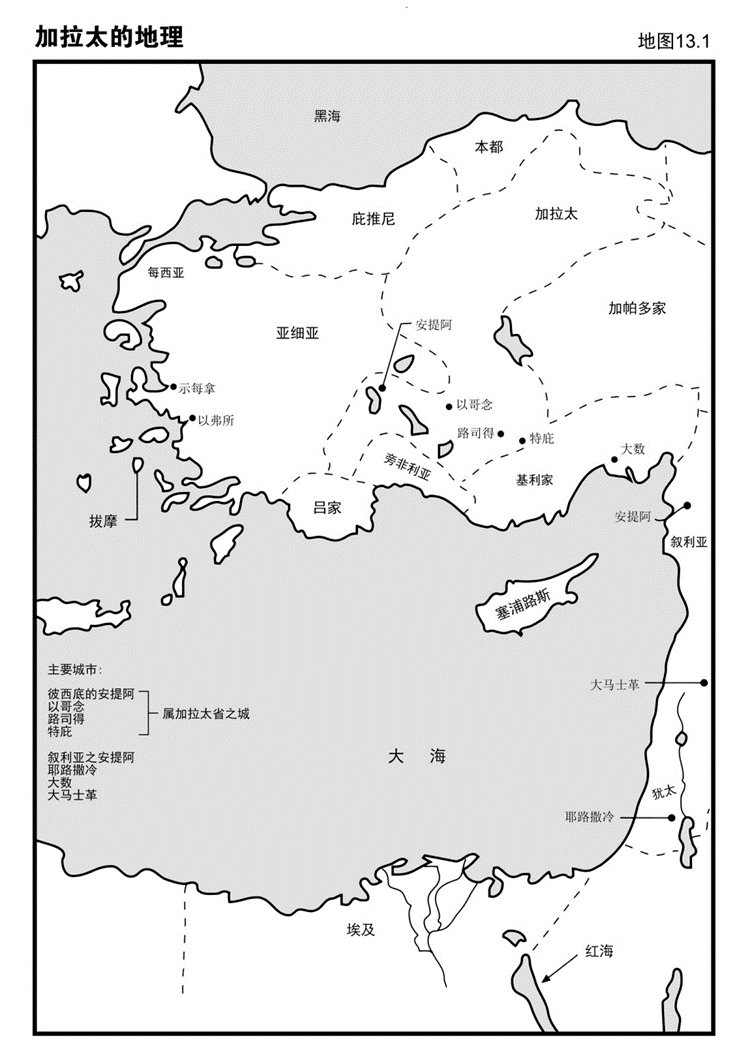 研读地图13.1,此图说明加拉太城市的地理环境。注意下列城市的位置:安提阿、以哥念、路司得、特庇。牢记这些城市的位置,以帮助你对此信的背景存有具体印象。