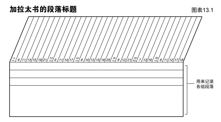 ② 参阅图表13.1,留意段落的划分(即经文的章节),在圣经上划下分部,然后阅读每个段落,定立标题。[8]