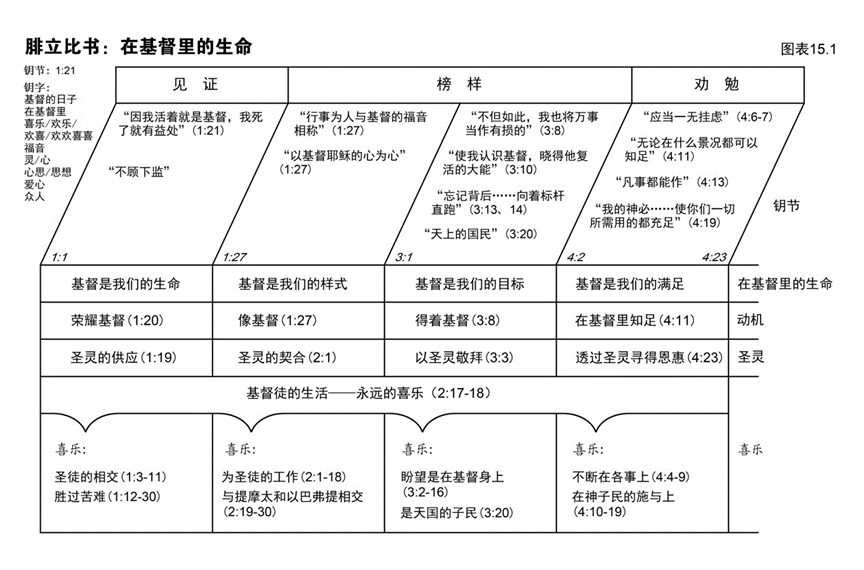 综览图表15.1显示了腓立比书的结构和重点。观察下列各项。