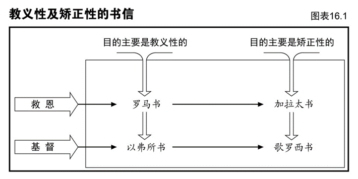 重温我们在较早前对以弗所书和歌罗西书所做的比较(图表14.2)。请也留意歌罗西书在以罗马书、加拉太书、以弗所书及歌罗西书这四卷书为一组的书信中的地位。图表16.1做了什么比较?
