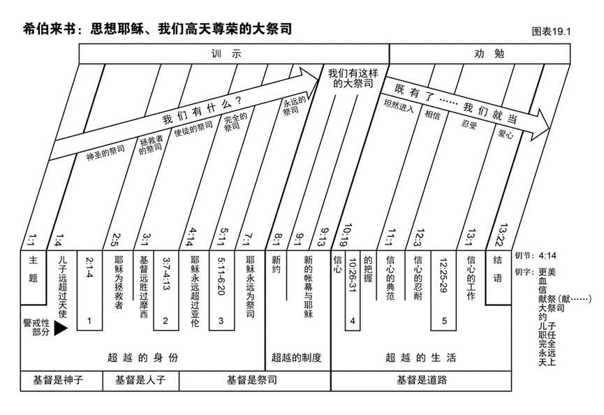 当综览图表概括出多个不同的专题研究时,这卷书信的结构便显而易见了。希伯来书综览图表19.1显示了书信本身的一些结构。仔细研读图表,然后记录下列各项如何显示在图表中。