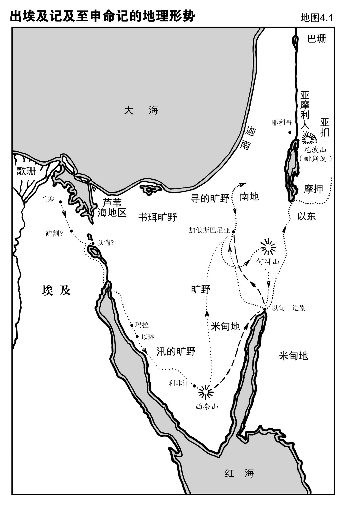 地图4.1说明出埃及的路线,读出埃及记时,可以参考这张图。歌珊是以色列人在埃及留居之地,注意其地理位置。请读出埃及记8章22节和9章26节。
