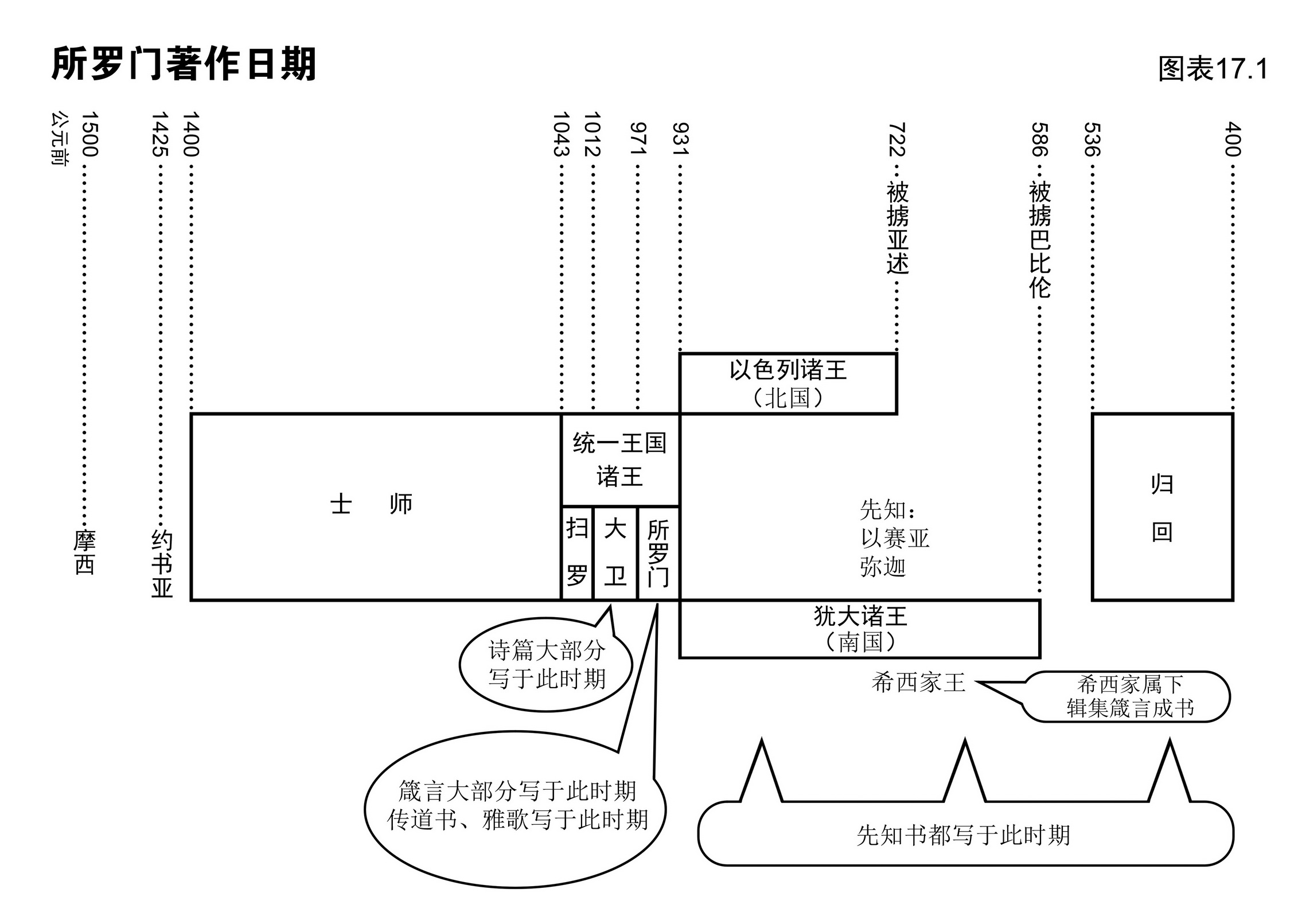 再参图表17.1,注意诗篇与箴言的写作时间相近。大卫的诗篇使我们清楚看到神的子民在王国倾覆之前如何敬拜,箴言则反映信徒如何热切关注他们应有的正直行为。后来在以色列背叛神和拜偶像年间,先知呼吁神的子民聆听神救赎的信息。
