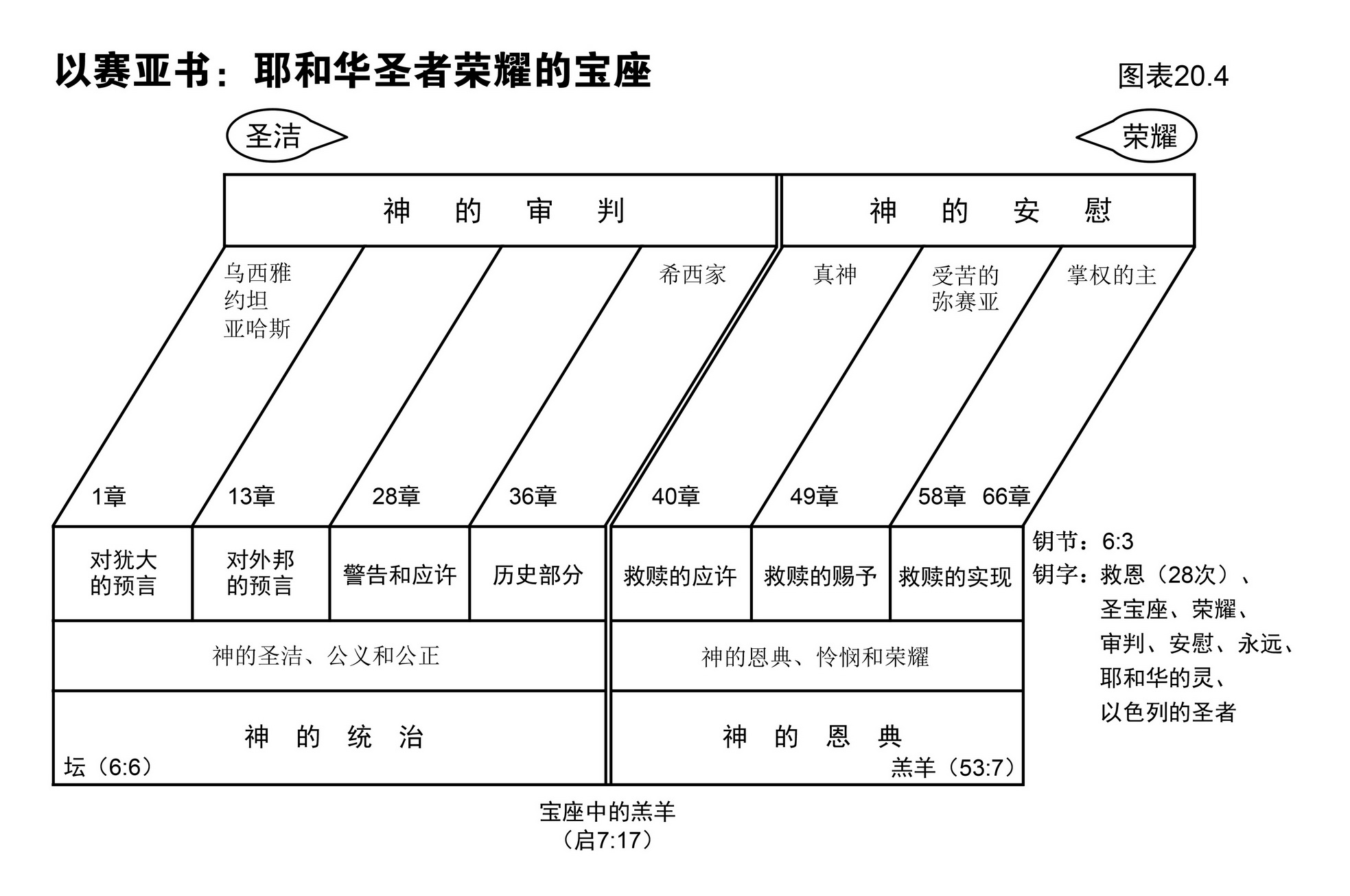 以赛亚如其他许多先知一样蒙神启示。他的预言有四个重点:当时形势,将要被掳,基督降临,以及新天新地。(参图表20.2)全书内容简述如下。