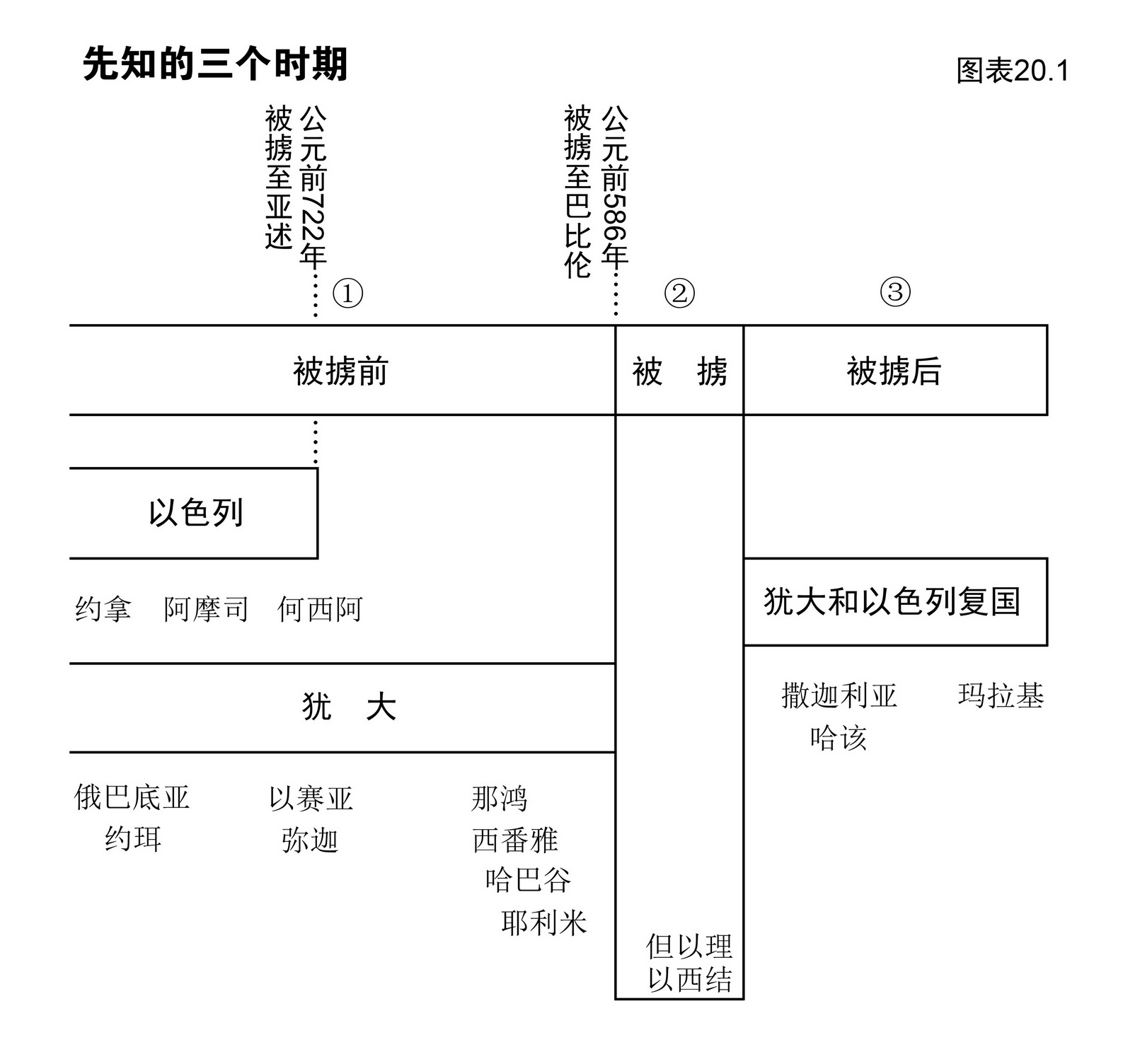 参图表20.2的A,先知如同站在高处向前瞻望,把所见到的讲出来。最常见的是揭发当时盛行的罪恶(参图表20.2中的①);然后向远处望去,看到民族被掳离开故土;又见到犹太人终于被释放归回(参②)。