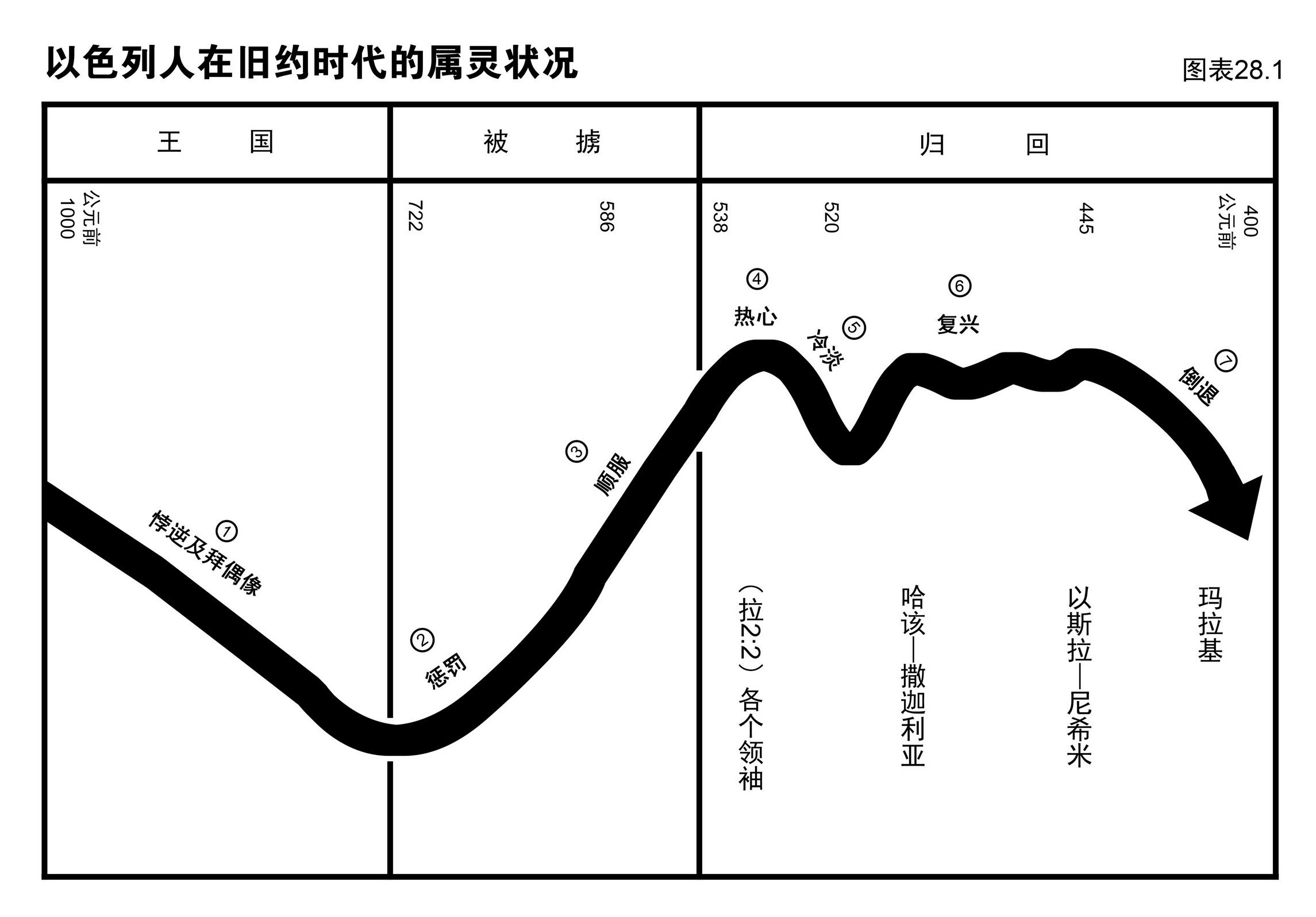 图表28.1是旧约以色列人属灵升降的情形,也说明哈该和撒迦利亚的事工有哪些影响。