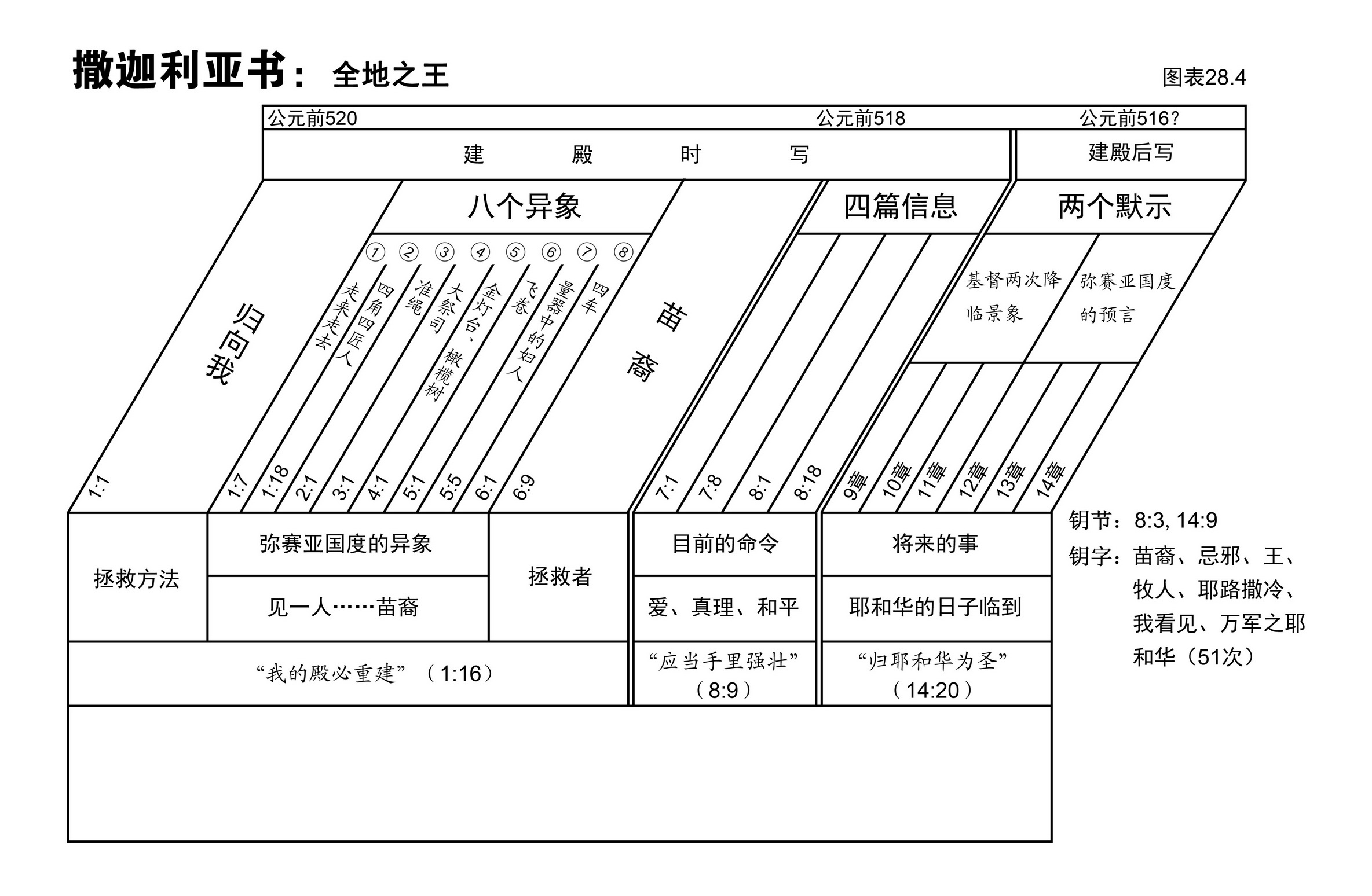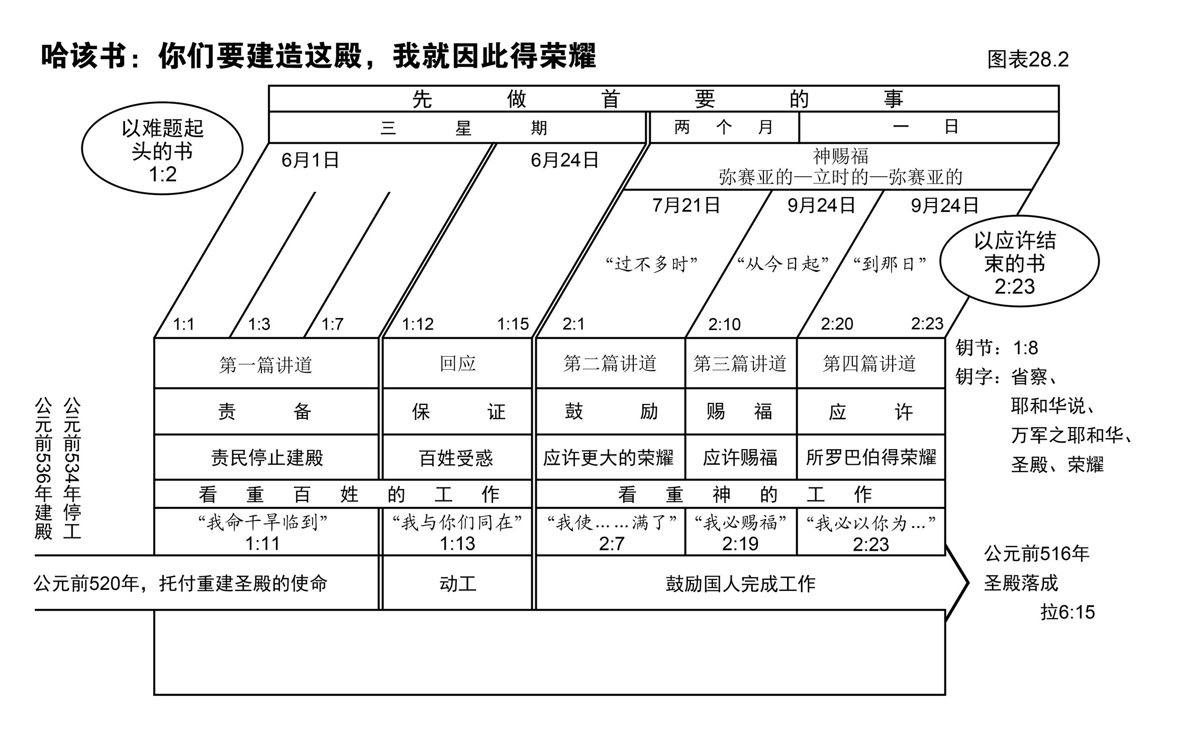 图表28.2说明了哈该书的结构。请仔细硏读该图表,再照下列提示硏读这卷书。请随时翻阅经文,以验证该图表的大纲和段落。
