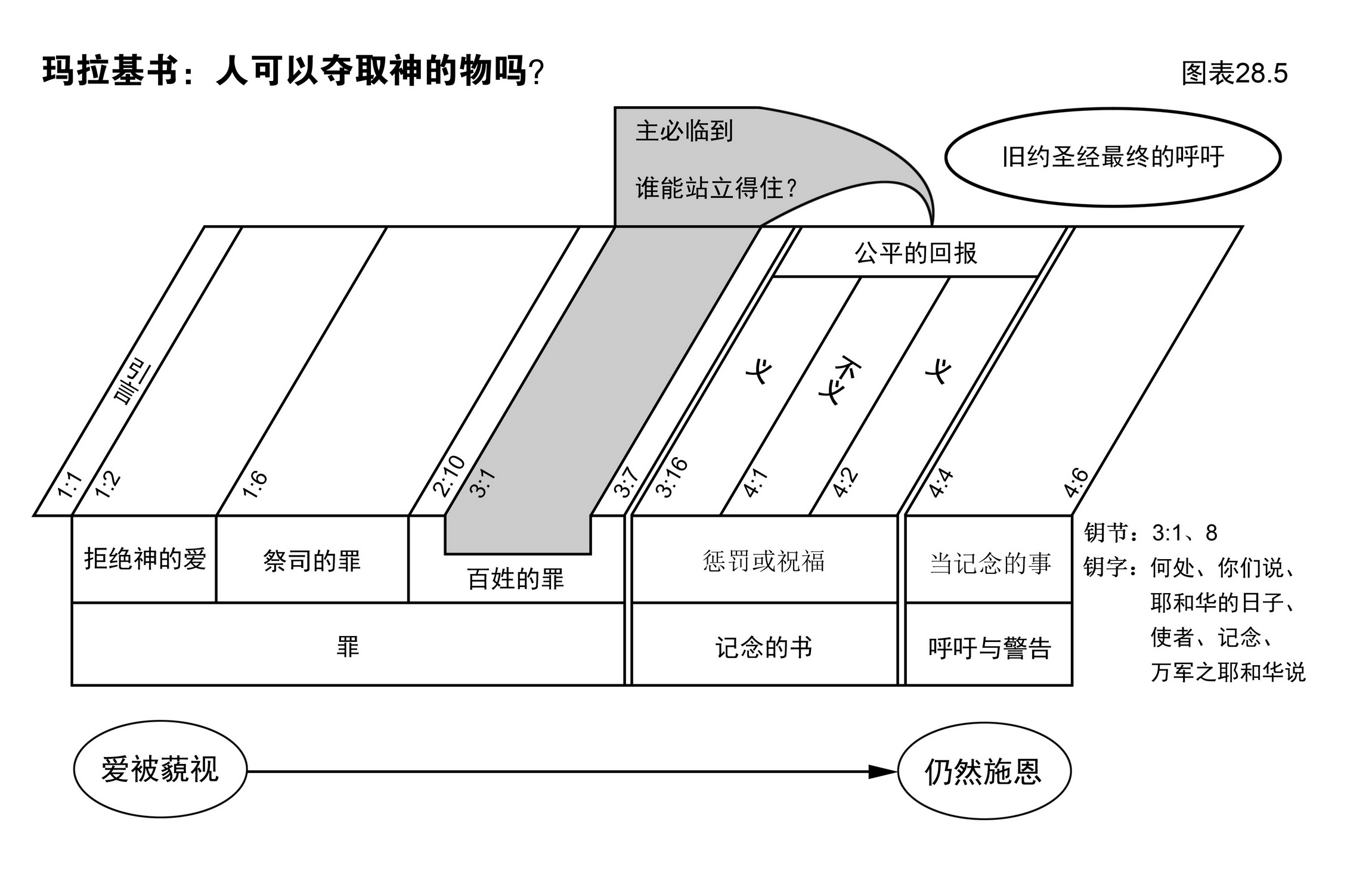 图表28.5是玛拉基书的综览,说明了玛拉基书的格式和重点。请读者先把整卷书略读一遍,再按一般的程序综览这书,然后依照以下方式硏读。(必须翻查所列出的经文)